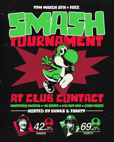 SUPER BROS. SMASH TOURNAMENTNintendo Switch | 48 Spots | $10 Buy Ins | CASH PRIZEHosted by Chris Banks & Thirtyspice FREE! RSVP with this link.PARKING: FREE street parking. FREE 4 hour garage parking. See Map.BAG POLICY: Purses allowed, no larger than 14”. Prepare for a brief bag check at the door. Weapons, non-prescription medications, and flash cameras will be held at the door. ID POLICY: Contact is 21+. Please present a valid form of identification to enter the premise. We accept unexpired driver licenses, state identification cards, passports, armed forces cards, and resident or crossing cards that contain a photograph and date of birth. Vertical ID’s may be used within 30 days of 21st birthday. See Acceptable IDsPHOTOGRAPHY POLICY: Flash and professional cameras are not permitted. Event organizers must have you listed in advance for approval.