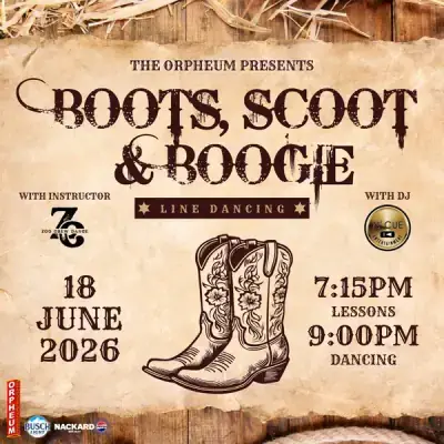 The Orpheum Presents 🎶 Boots, Scoot & Boogie 🎶- A Night of Line Dancing and Country Music Favorites with ZooCrew Dance and N'Cue Entertainment on Friday, June 18th at The Orpheum Theater in downtown Flagstaff, AZ!18+ | DOORS: 6:30PM | DANCE LESSONS: 7:15 PM | PARTY: 9PMTickets include lessons AND free dance!This event has LIMITED-CAPACITY - get your tickets early to secure your spot!Join us for a night of singles and partner line dancing with beginner and intermediate-friendly lessons led by expert instructor Jordan Galvin! Stick around after the class for a boot stompin' country music party, dancing, and some hometown fun!Can't make it to this date? Check out the rest of our summer dates ↓JULY 25AUGUST 29------------------------------The Orpheum Theater is a historic, indoor venue located on Aspen Street in downtown Flagstaff next to the Weatherford Hotel and Residence Inn.Parking is not available on site. Find info on street and garage parking here.Tickets are the same price at the box office and onlineA Full Bar is available at the venueNo outside food and beverage is allowed inEmpty, soft, clear water bottles will be allowed. No hydro flasks, metal, or hard plastic water bottles of any kind will be permitted inside the venue.Unless specifically stated by the show, venue has a strict no re-entry policyAs of September 1st, 2025, our security team will be enforcing a "Clear Bag Policy." Guests attending public-ticketed events are permitted to bring a 12″ x 6″ x 12″ or smaller CLEAR stadium bag, or a gallon-sized clear zip bag. Permitted non-clear bags include wristlets measuring 4″x6″x1″ and smaller, and/or diaper/medical bags, which are subject to search. No other bags are permitted; bag storage is NOT available at the theater. Clear bags are available for purchase. Thank you for your understanding. For a complete list of Permitted & Prohibited Items click hereWhere to Stay in FlagstaffAccessibilityFAQ